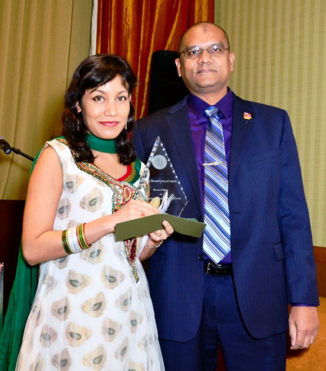 Mr. Yashmid Ellis Karamath (right) presents Ms. Sneha Hazarika-Rampersad